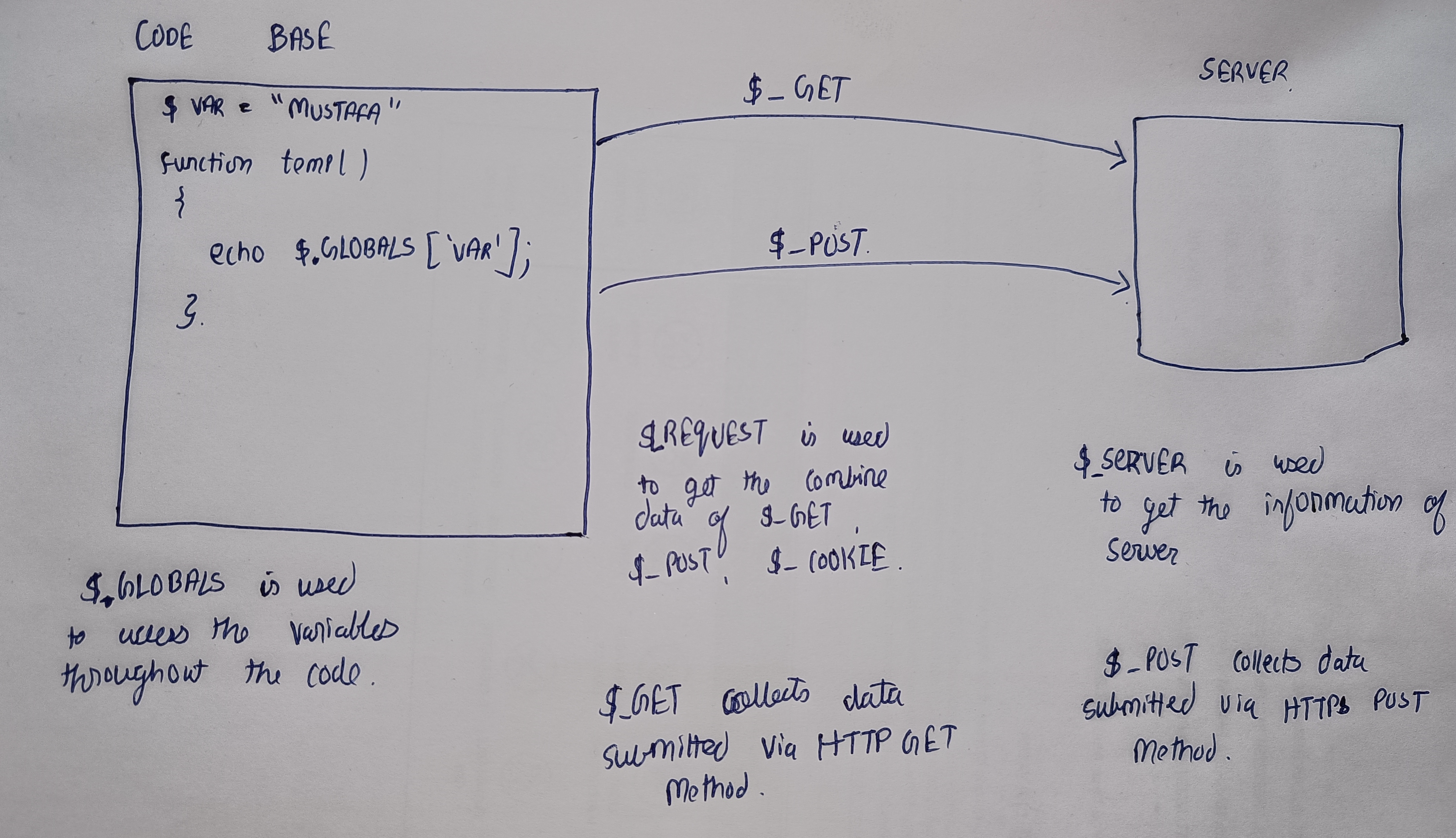 Below diagram is for the difference between $GLOBALS, $_SERVER, $_REQUEST, $_GET and $_POST.
